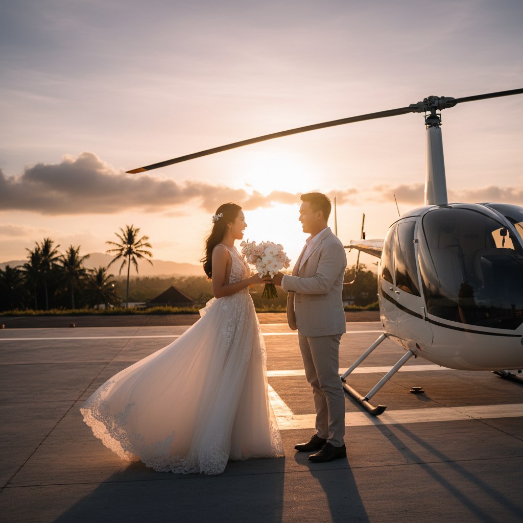 The Wedding & Proposal Flight is also used for wedding day experiences — a couple and their closest companions sharing a 45-minute flight over Bali before or after the ceremony. Some couples incorporate the helicopter into the wedding day itself, departing from the ceremony venue and arriving at the reception location. We can coordinate departure and arrival times with your wedding planner. The aircraft can be decorated for the occasion with flowers or ribbon (subject to aviation safety requirements), and we can arrange a professional videographer to film the flight as part of your wedding documentation.